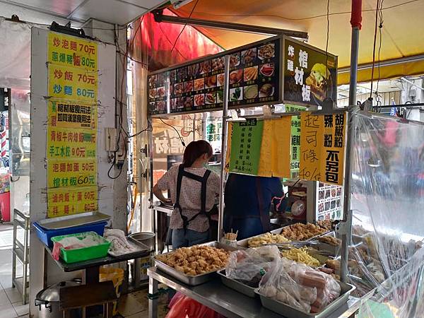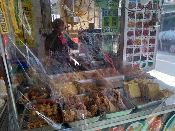 因為在路邊,為了讓食物不要被髒空氣污染,所以前面都會用一塊透明的布蓋起來,往後面一看,看到很多產品標示價格,再仔細一看,炸東西的攤位有點老舊,顯示出他們經過多年的歲月。