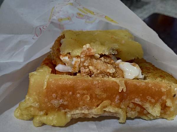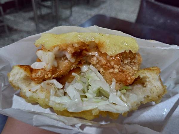 剛炸好的果然很燙,裡面除了炸雞塊還有一點高麗菜絲及沙拉醬,整個是塞好塞滿的,炸雞塊吃起來還帶點微辣,帶點高麗菜是解解他的油膩,所有食材包在裡面咬一口風味更獨特。
